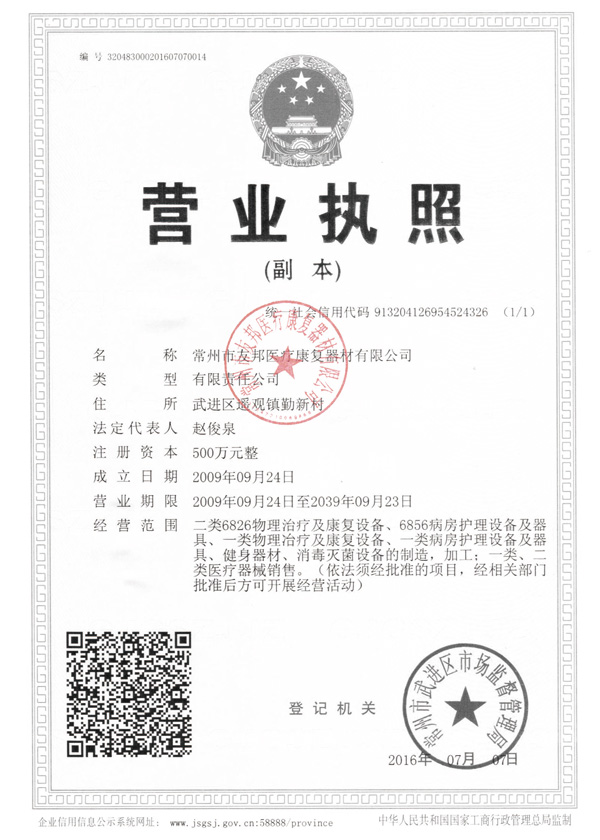 常州市友邦醫(yī)療康復器材有限公司位于江南水鄉(xiāng)常州市遙觀鎮(zhèn), 緊鄰京滬高鐵、滬寧高速公路、沿江高速公路和312 國道,交通十分便利。公司是國內(nèi)生產(chǎn)康復器材的 大型企業(yè)之一,有著完善的硬件設施和規(guī)范的管理體系。公司借鑒并吸收了業(yè)界康復器材技術,逐漸發(fā)展成為集開發(fā)、生產(chǎn)、銷售于一體的生產(chǎn)企業(yè)。公司現(xiàn)主要產(chǎn)品有牽引治療儀系列、步態(tài)訓練系列、上下肢運動系列、全身運動系列、水療系列、兒童康復系列等多個系列產(chǎn)品。